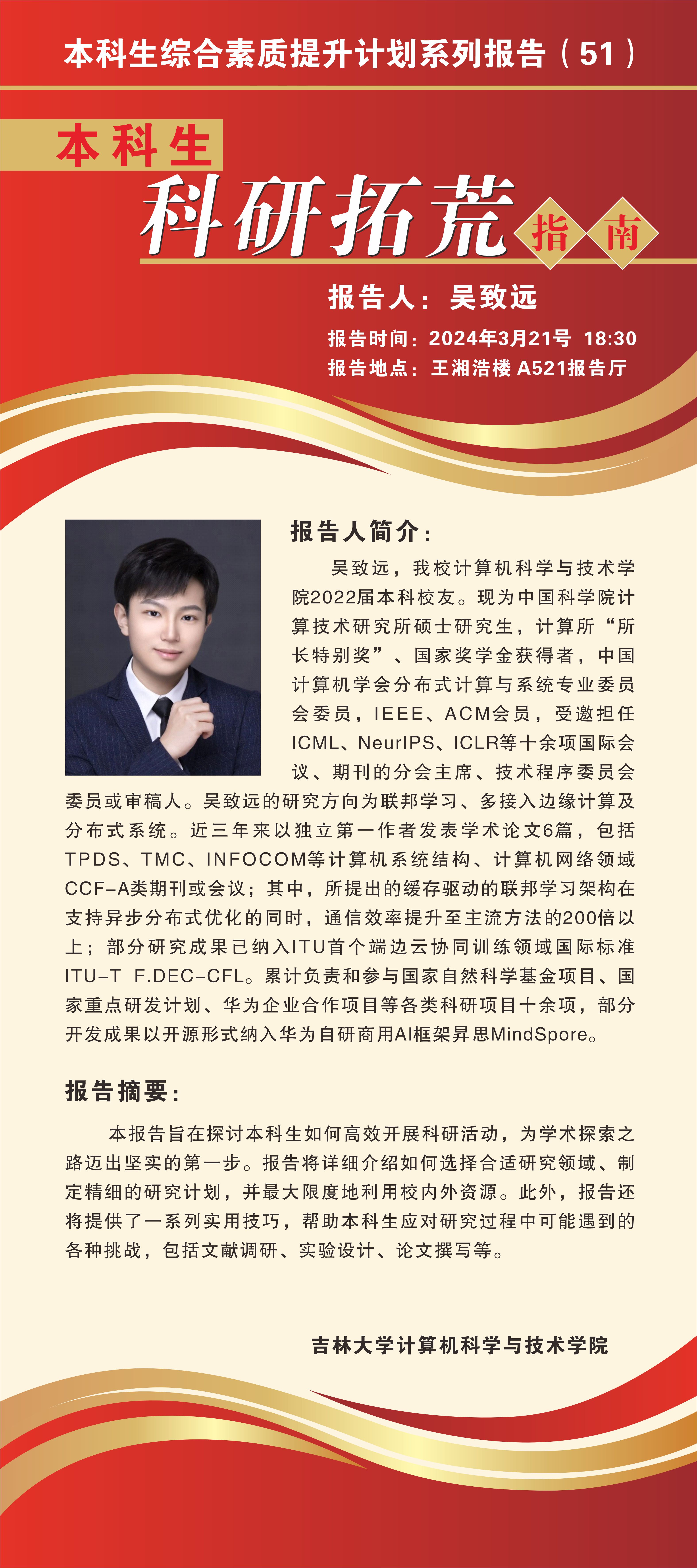 2022届本科校友。现为中国科学院计算技术研究所硕士研究生,计算所“所长特别奖”、国家奖学金获得者,中国计算机学会分布式计算与系统专业委员会委员,IEEE、ACM会员,受邀担任ICML、NeurIPS、ICLR等十余项国际会议、期刊的分会主席、技术程序委员会委员或审稿人。吴致远的研究方向为联邦学习、多接入边缘计算及分布式系统。近三年来以独立第一作者发表学术论文6篇,包括TPDS、TMC、INFOCOM等计算机系统结构、计算机网络领域CCF-A类期刊或会议;其中,所提出的缓存驱动的联邦学习架构在支持异步分布式优化的同时,通信效率提升至主流方法的200倍以上;部分研究成果已纳入ITU首个端边云协同训练领域国际标准ITU-T F.DEC-CFL。累计负责和参与国家自然科学基金项目、国家重点研发计划、华为企业合作项目等各类科研项目十余项,部分开发成果以开源形式纳入华为自研商用AI框架昇思MindSpore。