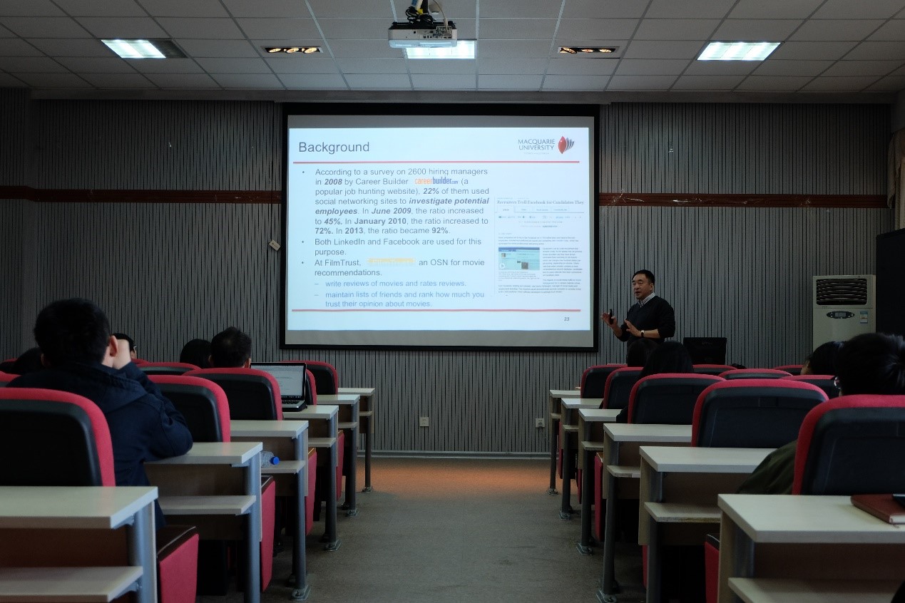 计算机学院做了题目为“Trust Management in Social Networks and E-Commerce Applications”的学术报告。王岩是澳大利亚Macquarie大学计算机系副教授,于哈工大获得博士学位,曾在新加坡国立大学进行博士后研究工作。目前是澳大利亚 Macquarie大学计算机系的副教授,并主管研究生事务 (HDR Director), 也担任哈尔滨工业大学的客座教授,主要从事可信计算,社会网络,服务计算,和推荐系统等方面的研究。王岩副教授目前是IEEE Trans. on Services Computing (TSC), 和Springer关于服务计算和社会网络的两个国际期刊的编委。曾担任多个国际会议的大会主席或程序委员会主席。近年来论文主要发表在AAAI, AAMAS, IEEE SCC, IEEE ICWS, ICSOC等会议, 和 IEEE Trans. on Services Computing (TSC), IEEE Trans. on Knowledge and Data Engineering (TKDE), 和ACM Trans. on the Web (TEB)等期刊上。王岩副教授曾获得2010年Macquarie大学学院教学奖和2014年学院优秀导师奖。他的团队分别获得IEEE SCC2010和IEEE TrustCom2012最佳论文奖, 并获得IEEE ICWS2016最佳学生论文奖。