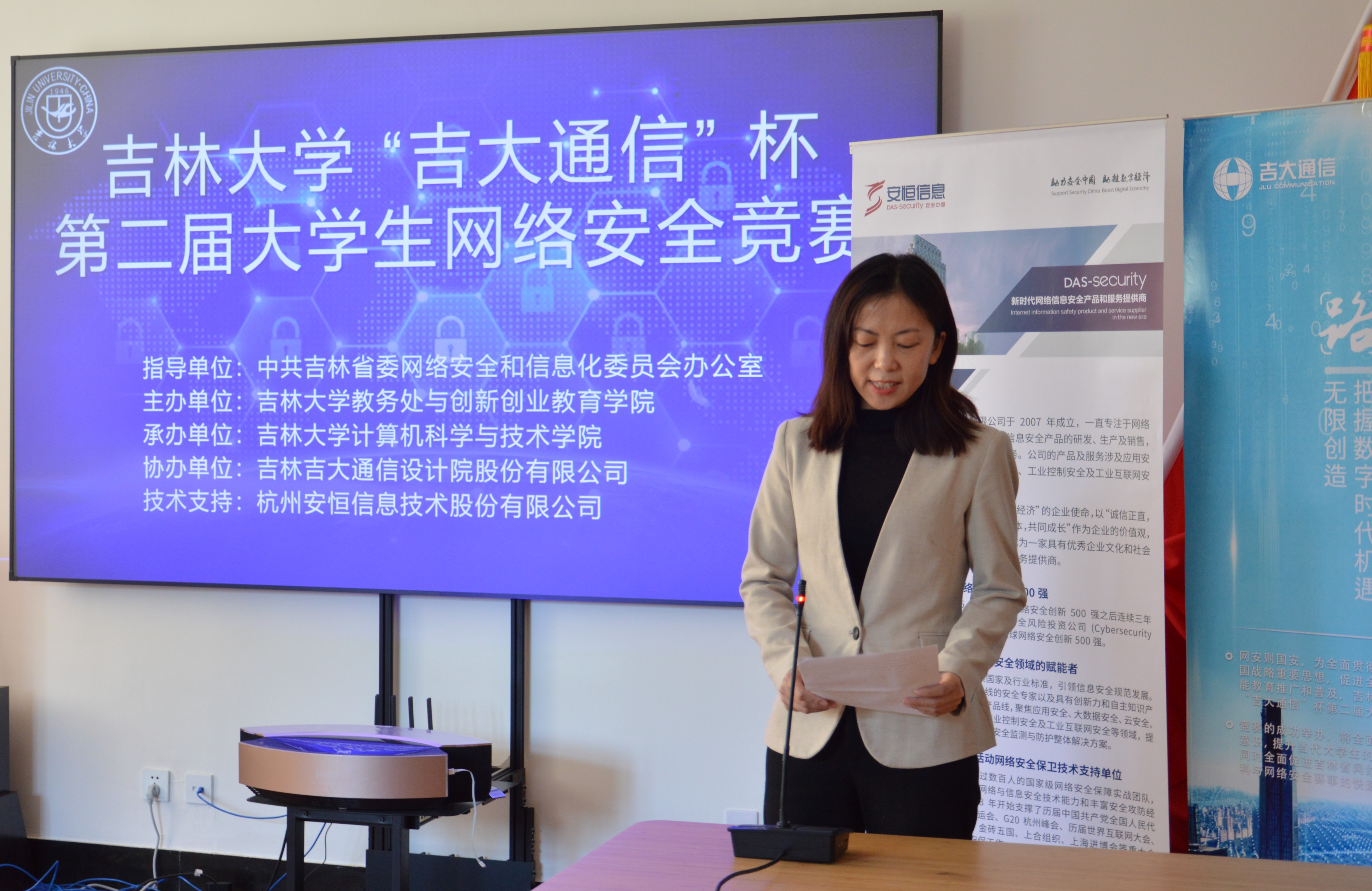 副院长黄岚教授发表了热情洋溢的讲话,她对获奖的同学表示祝贺,对协办单位吉林吉大通信设计院股份有限公司和技术支持单位杭州安恒信息技术股份有限公司的大力支持以及竞赛组委会的精心筹备表示衷心的感谢,并表示吉大人会“不忘初心、牢记使命”,绿帽