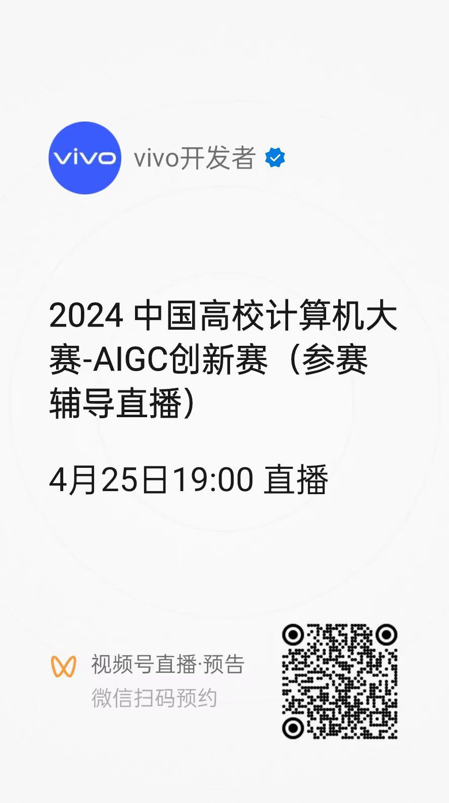 竞赛相关介绍可登录赛事官网查询了解(//aigc.vivo.com),本月25号(周四)19:00有参赛辅导直播课(见下图微信扫码预约)。请广大师生关注赛事动态,积极组队报名参赛,共同推动我院在AIGC领域的创新与发展。