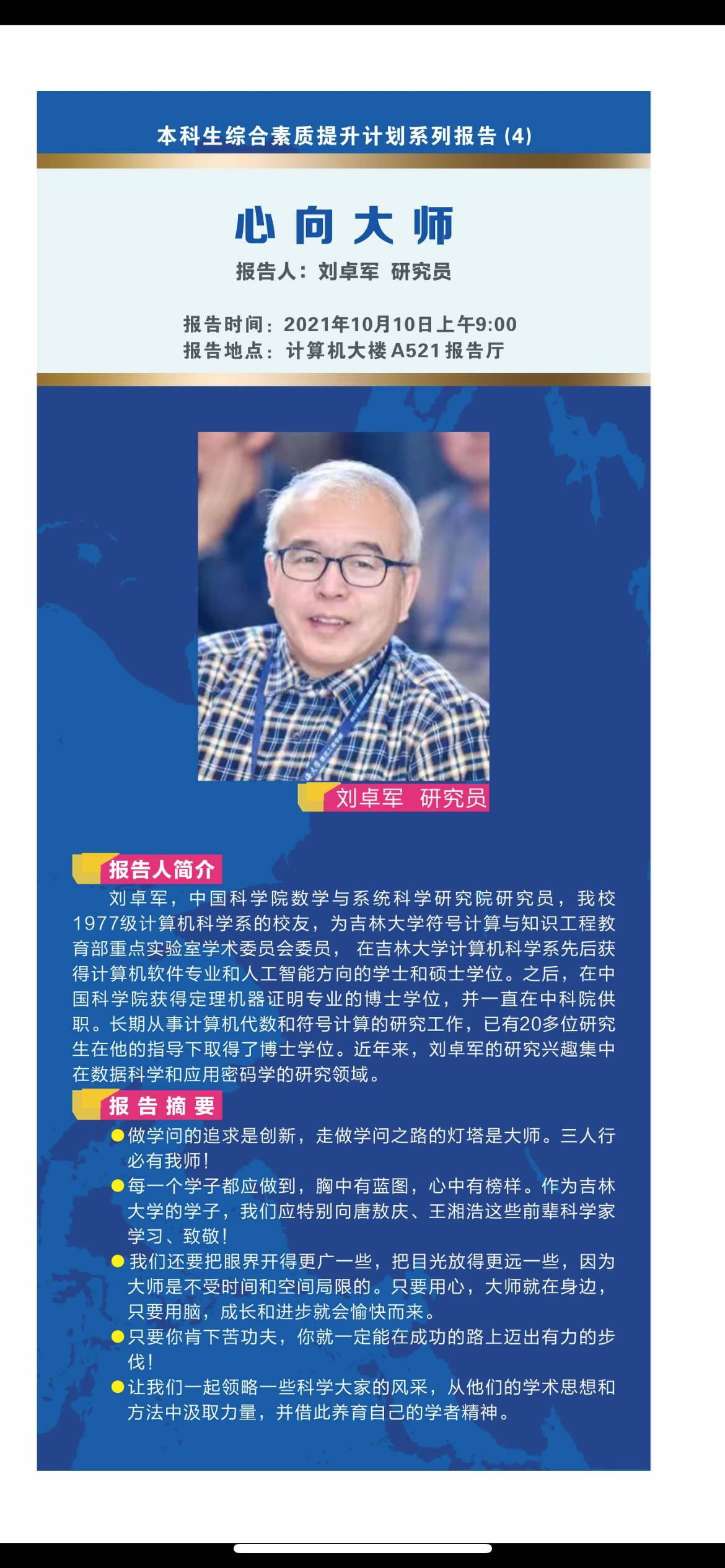 中心校区计算机楼A521报告厅作了题为“心向大师”的专题报告,这是本科生综合素质提升计划系列报告的第四场,报告由绿帽