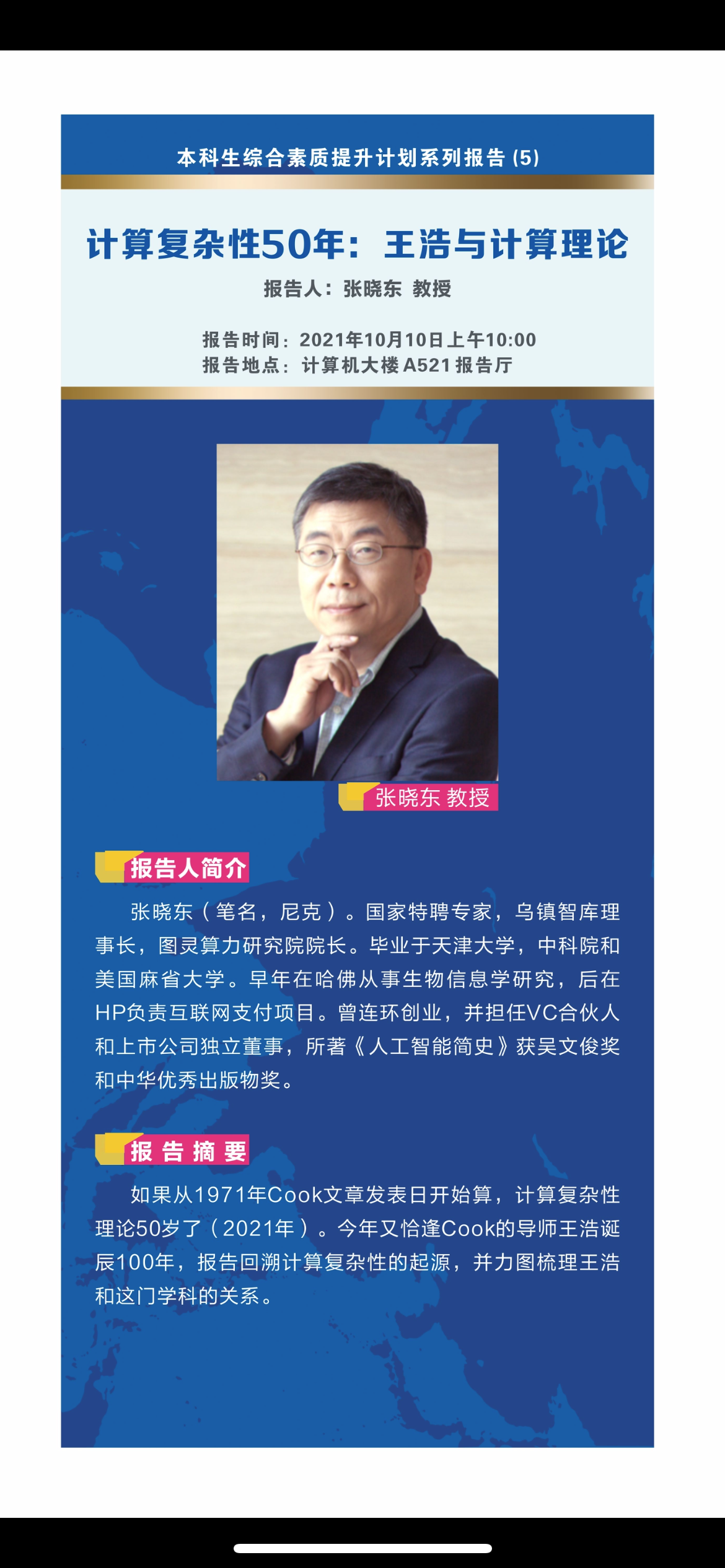中心校区计算机楼A521报告厅作了题为“计算复杂性50年:王浩与计算理论”的专题报告,这是本科生综合素质提升计划系列报告的第五场,报告由绿帽