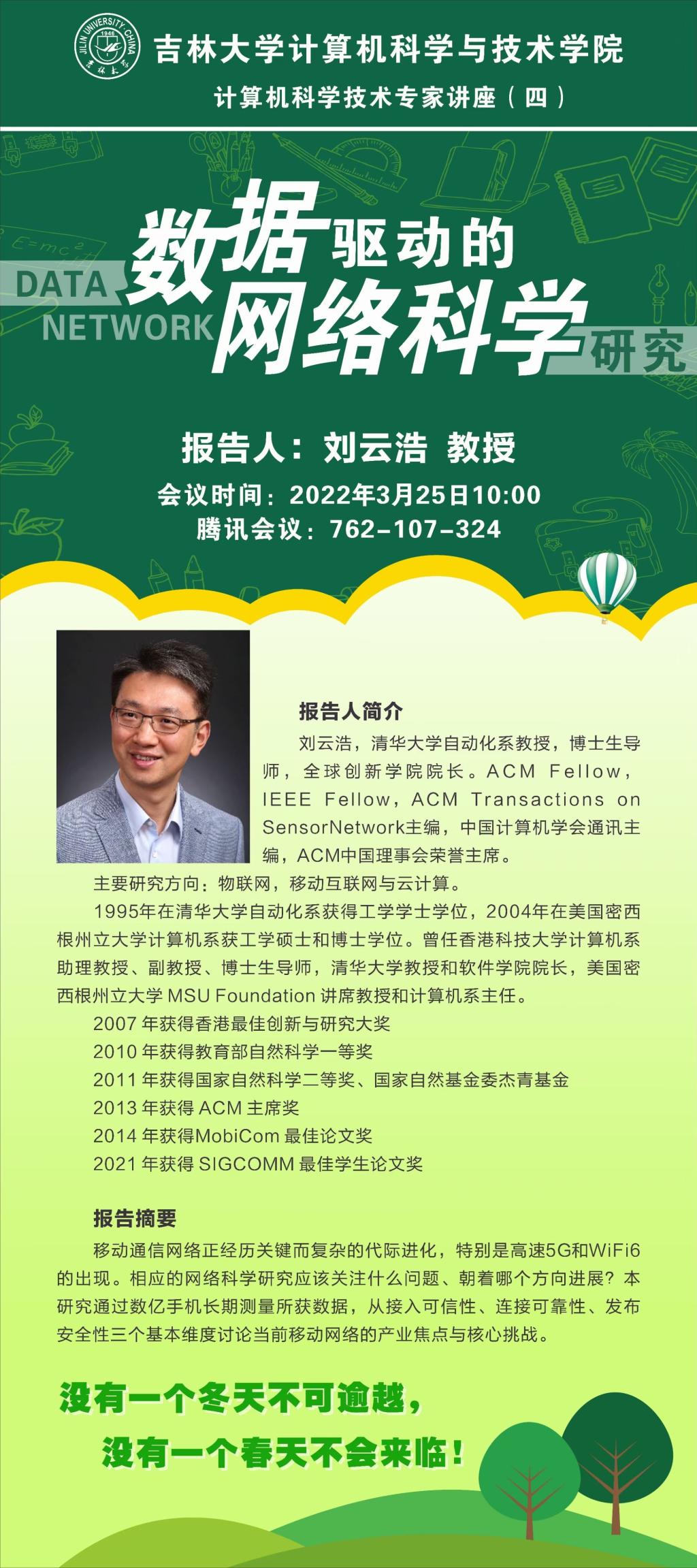 邀请,利用腾讯会议作了题为“数据驱动的网络科学研究”的学术报告,也是计算机科学技术专家系列讲座的第四场。绿帽
