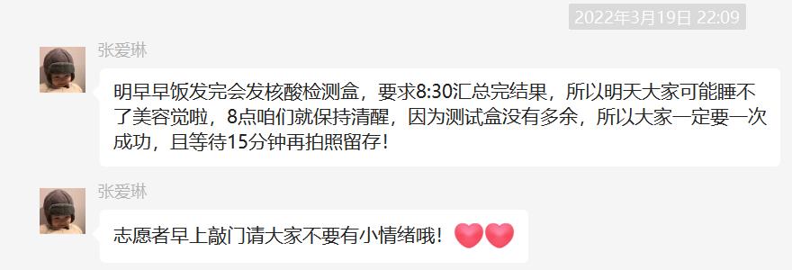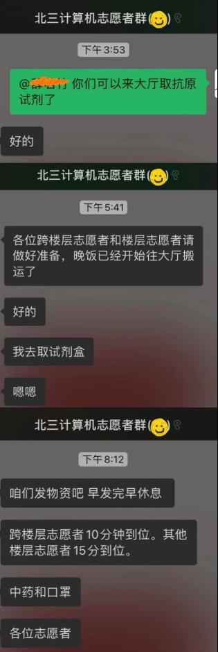 同一时刻,线上的志愿工作也在有条不紊地开展。为实时了解同学们状况、第一时间提供帮助,志愿者们建立了北三计算机通知群,每天在群里认真核对学生用餐人数,传达学校和学院的通知,统计同学们的核酸情况,倾听同学们的意见和需求,安抚同学们封寝时间焦躁的心情。在有些生活用品及药品紧缺的情况下,志愿者们第一时间组织群里的同学们互相帮助,群策群力;面对同学们的一些小情绪和小烦恼,志愿者们也积极调解。前段时间按照学校的防疫要求,大家每天早上都需要按时提交抗原自测结果,同学们不免需要在睡眼惺忪的时候起床检测。每每这时候,志愿者负责人张爱琳总是和平常一样,细心温柔地叮嘱大家,瞬间安抚了同学们的情绪。