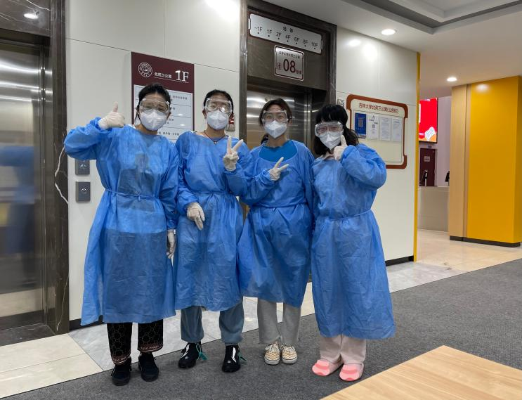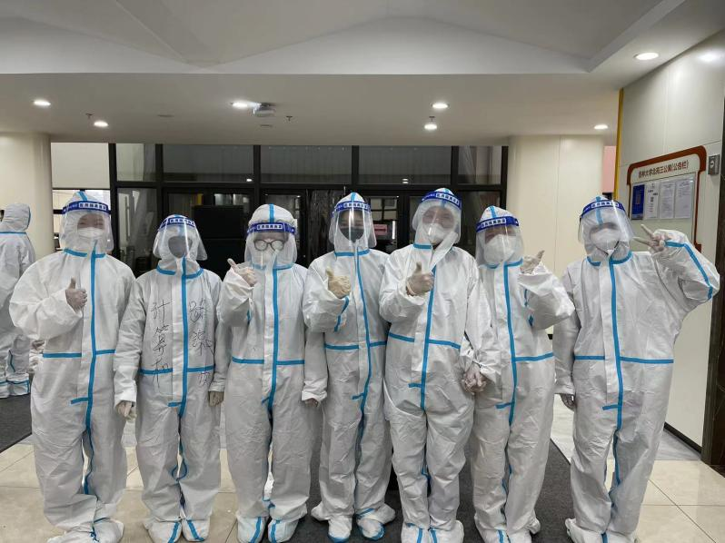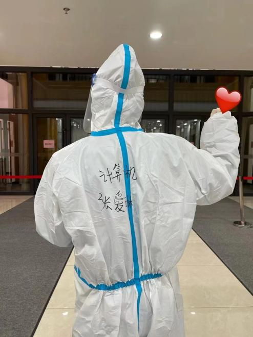 当志愿者们穿上防护服,北三公寓志愿者队的张爱琳感慨:“那是我们第⼀次感受防护服里的世界,脱下来的时候每个人都湿了头发,但大家依然开心能够贡献自己的⼀份力量”。学院高战国副书记与何老师亲赴一线,为同学们送来防疫物资,解决了送物资难,缺物资急的燃眉之急。