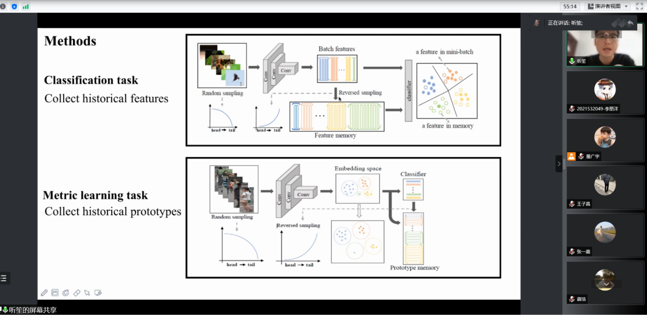 会议第一阶段,讲者刘家伦带来了以“长尾分布下的特征学习”为主题的论文分享。讲者首先介绍了长尾分布,这是一种数据不平衡的极端情况,例如在一个数据集中,种类多的数据被称为头部类,种类少的数据被称为尾部类,这样分布不均的情况为深度模型的学习带来了巨大的挑战。针对这个问题,讲者提出了Feature Cloud,MBJ(Memory-based Jitter),MAUM(Memory-Augmented Unidirectional Metrics)三种方法,缓解了尾部类数据在模型学习过程中类内多样性不足的问题,并在长尾特征学习以及长尾分类学习两个任务中都验证了方法的有效性。