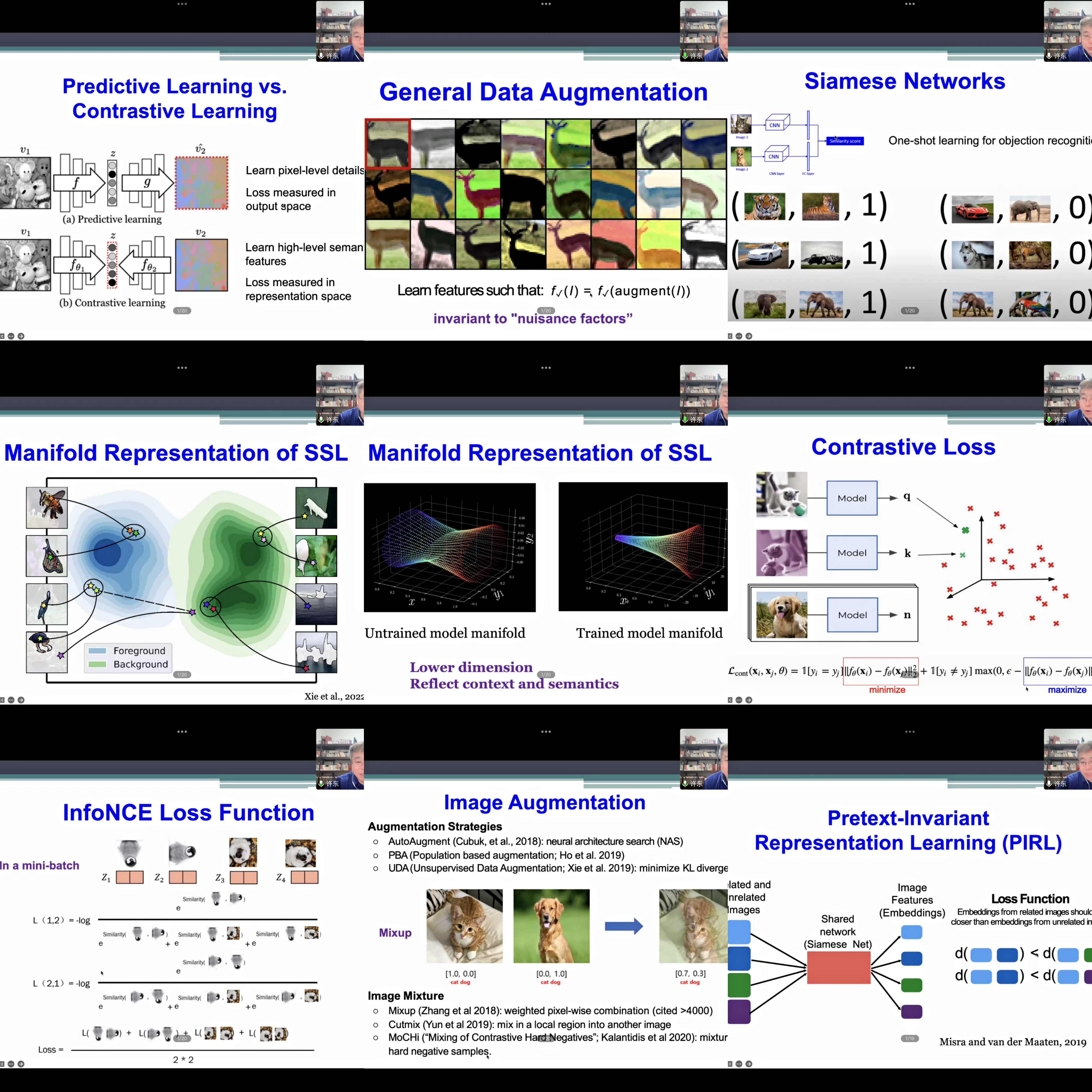 近年来,自我监督学习 (SSL) 通过利用大量未标记数据集获得有意义的语义表示,取得了令人瞩目的成功。SSL采用自定义伪标签作为监督策略,通过学习显著提高下游任务的性能。在本次报告中,许东教授由浅入深的带领大家回顾了三种主要的SSL方法,即自我预测、对比学习和减少冗余,许东老师也提供了各个方法的相关详细信息和比较,包括对比学习方法(PIRL,SimCLR,MoCo),基于聚类的方法(DeepCluster,SwAV),基于知识蒸馏的方法(BYOL,SimSiam),减少冗余方法(Barlow Twins,VICReg)和多模态学习方法(DCCA,CLIP)。
