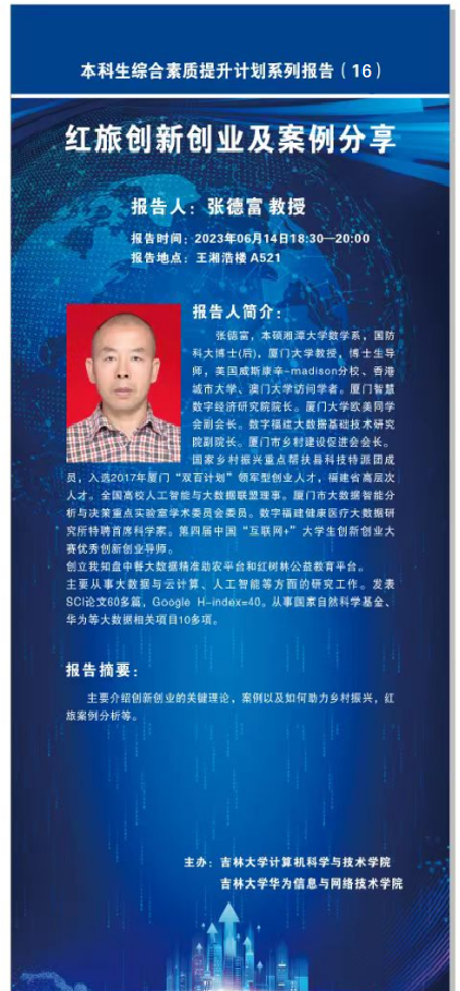 中心校区王湘浩楼A521报告厅作了题为“红旅创新创业及案例分享”的专场讲座,也是本科生综合素质提升计划系列报告第16场。讲座由绿帽