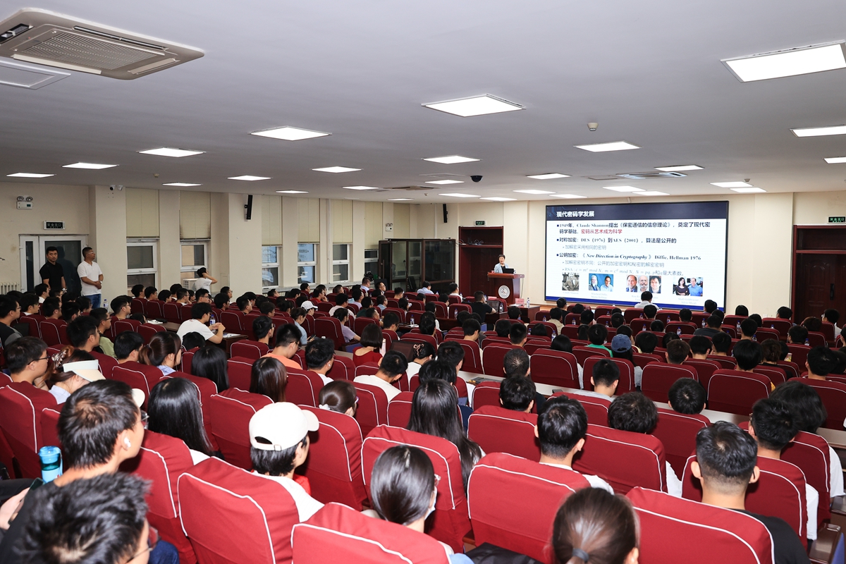 当前广泛部署的公钥密码算法无法抵抗未来量子计算机攻击,基于抗量子计算机攻击数学难题的密码,也称后量子密码,已成为新一代公钥密码发展方向,受到全球高度重视。王小云表示,随着量子计算技术的飞速发展,传统密码体系面临着前所未有的挑战,而后量子密码作为应对这一挑战的关键手段,正成为全球密码学界的研究焦点。这一领域的突破对于保障国家信息安全、维护数字经济的稳定发展具有至关重要的意义。王小云从“后量子密码研究背景”“高维格理论数学难题”“格密码的实用化展望”三个方向,介绍了当前后量子密码全球发展态势,并围绕后量子密码国际主流方向格密码展开,介绍了高维格理论数学困难问题及求解算法、当前格密码算法实用化进程以及全同态加密研究的最新进展,通过丰富的实例和数据为在场师生带来一场精彩纷呈的学术盛宴,并与师生展开互动交流。