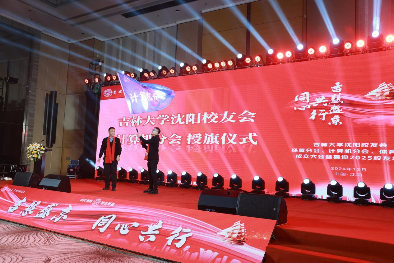 校友会副秘书长尹彪,为沈阳校友会计算机分会授旗。这面旗帜,不仅承载着母校对校友们的殷切期望,也标志着计算机分会正式扬帆起航,开启新的征程。