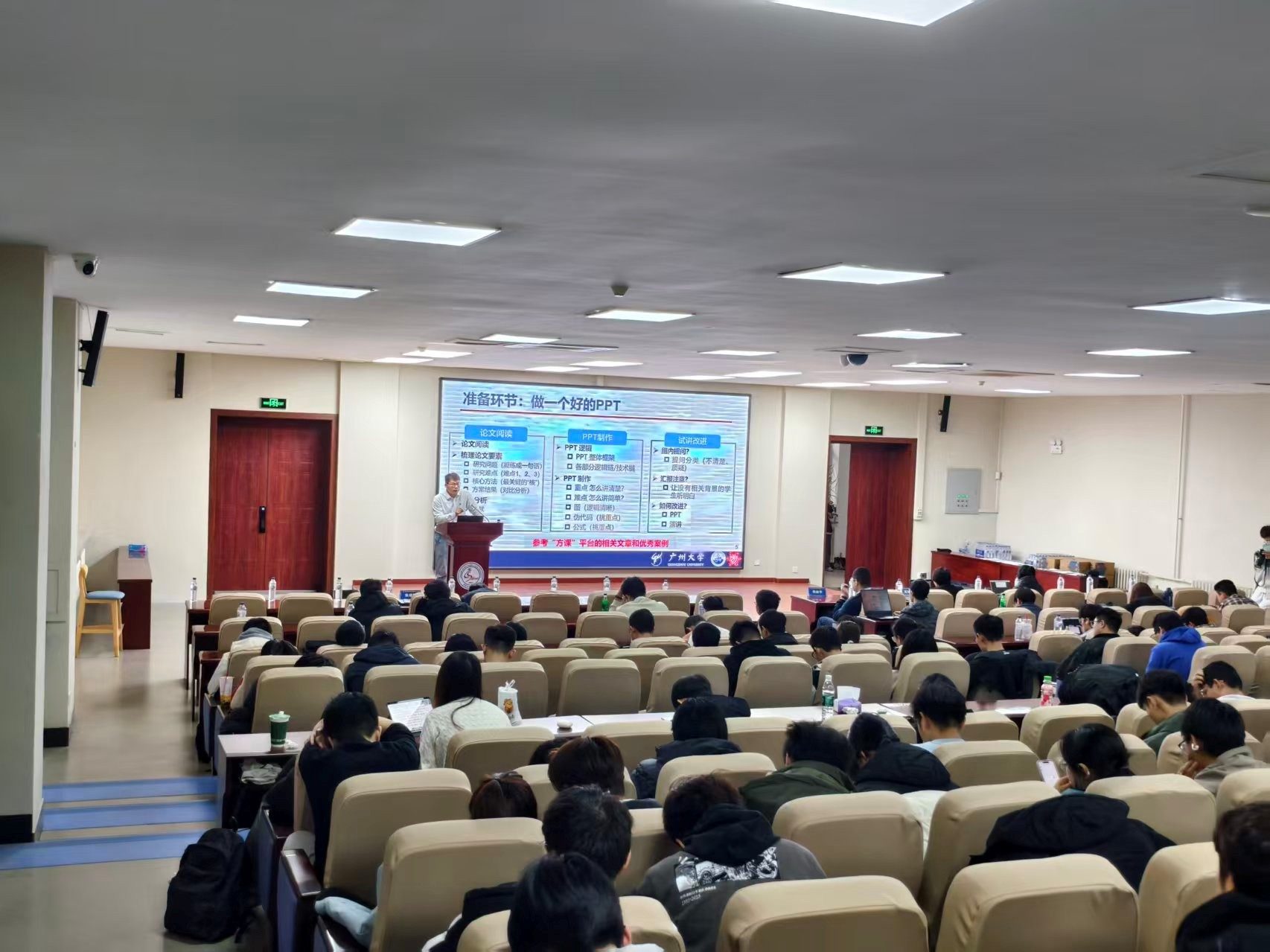 当日下午,全体师生齐聚王湘浩楼 B108,参加方班研讨厅专题报告。报告中殷丽华教授首先围绕“求源・熵减・思辨”教学方法,系统阐述方班研讨厅的教学理念与实践路径;随后,吴联仁老师介绍论文选题的9类方向,结合案例强调“先避坑”原则与选题关键;束成钢老师明确研讨厅5个核心角色,细化选题、准备、报告、总结各环节要求及“论文信息、背景、方法、实验”四大考核指标;孙哲老师给出课中提问标准与正反案例,同时指出课后总结的常见问题;朱天清老师从提问老师视角,阐述其“思维引导者与学术桥梁”的定位,结合具体案例讲解提问方法,强调前期研读准备的重要性及自身成长路径。