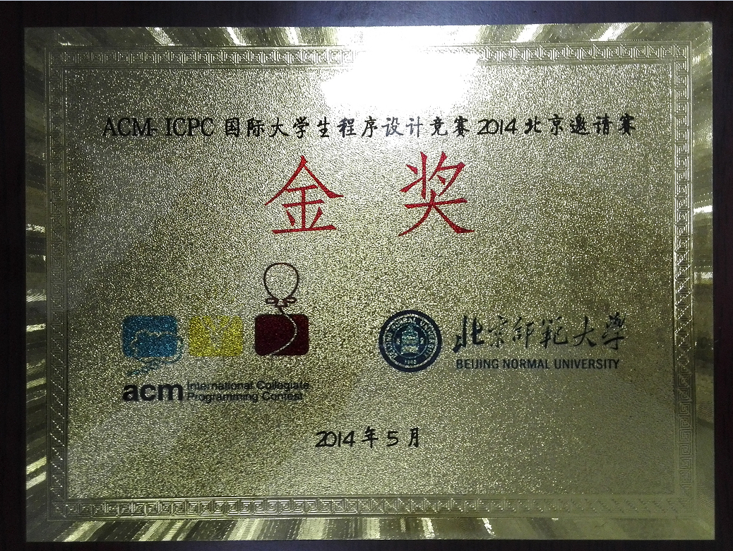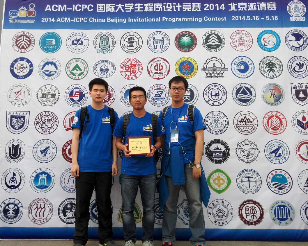 ACM-ICPC国际大学生程序设计竞赛2014北京邀请赛于2014年5月17至18日在北京师范大学举行。清华大学、北京大学、浙江大学、复旦大学、南京大学等77所国内知名高校的154支参赛队参加了此次比赛。这次比赛是2014年前半年该项赛事国内最重要的竞赛,经过激烈的角逐,共决出15枚金牌、32枚银牌和49枚铜牌。我校获得15枚金牌中的2枚。由软件学院2011级本科生蔡俊雄,计算机学院2013级本科生邵帅和章佳豪组成的队伍获得第9名,由计算机学院13级本科生唐家铭、软件学院2012级本科生药剡和赵强组成的队伍获得第12名。