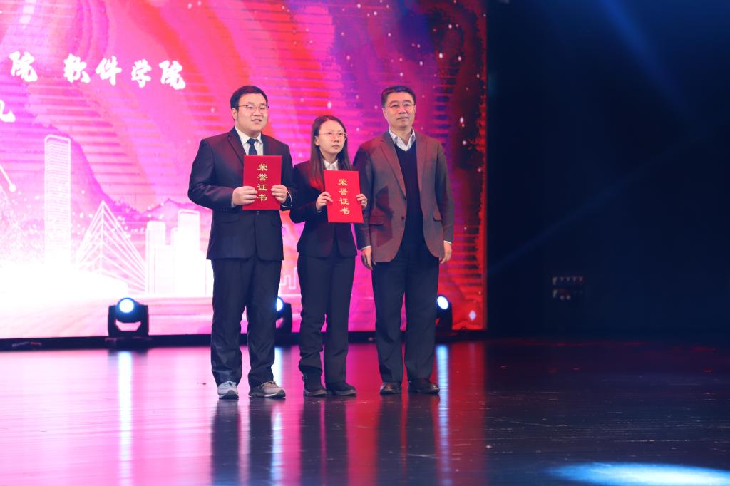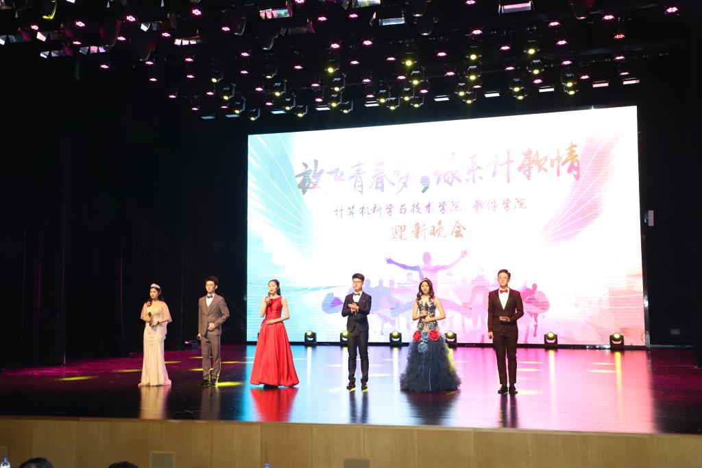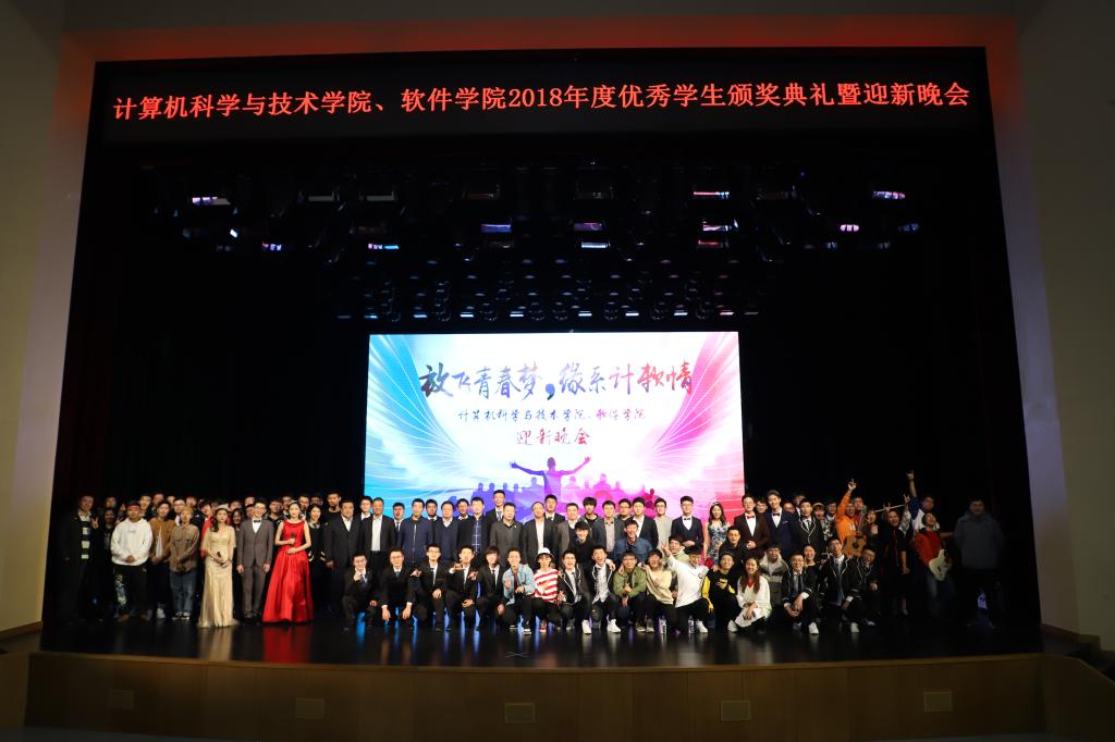 、软件学院在鼎新大讲堂联合举办了2018年度优秀学生颁奖典礼暨“放飞青春梦,缘系计软情”迎新晚会。出席晚会的嘉宾有学生工作部部长张国兴老师,研究生工作部副部长赵玥老师,教务处处长刘鹤老师,保卫处处长宫皓宇老师,学生就业创业指导与服务中心主任钟新老师,校团委书记代磊老师,绿帽