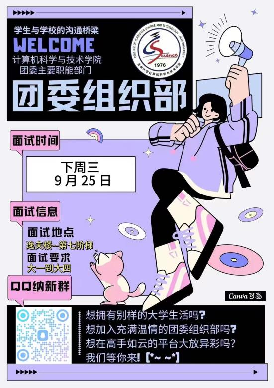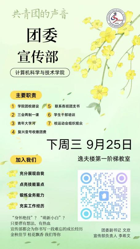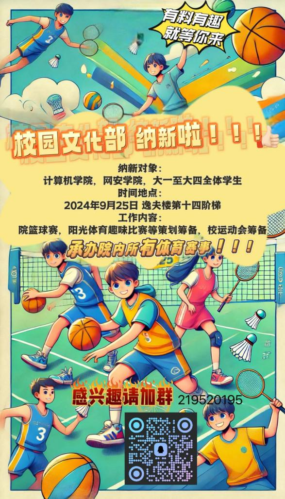 如果你热衷活动策划、热爱文体,想要在大学生活中结识更多志同道合的朋友,欢迎加入计算机学院校园文化部!