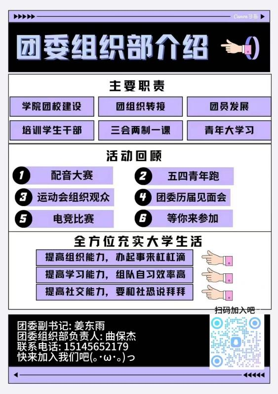 在团委组织部,你将遇见一群志同道合、充满激情的伙伴,共同策划并参与各类精彩纷呈的活动,在这里,你不仅能够锻炼自身组织协调能力,更能在实践中不断成长,收获珍贵的友谊。我们期待同学们的加入,与我们一起为校园文化的繁荣发展贡献力量。