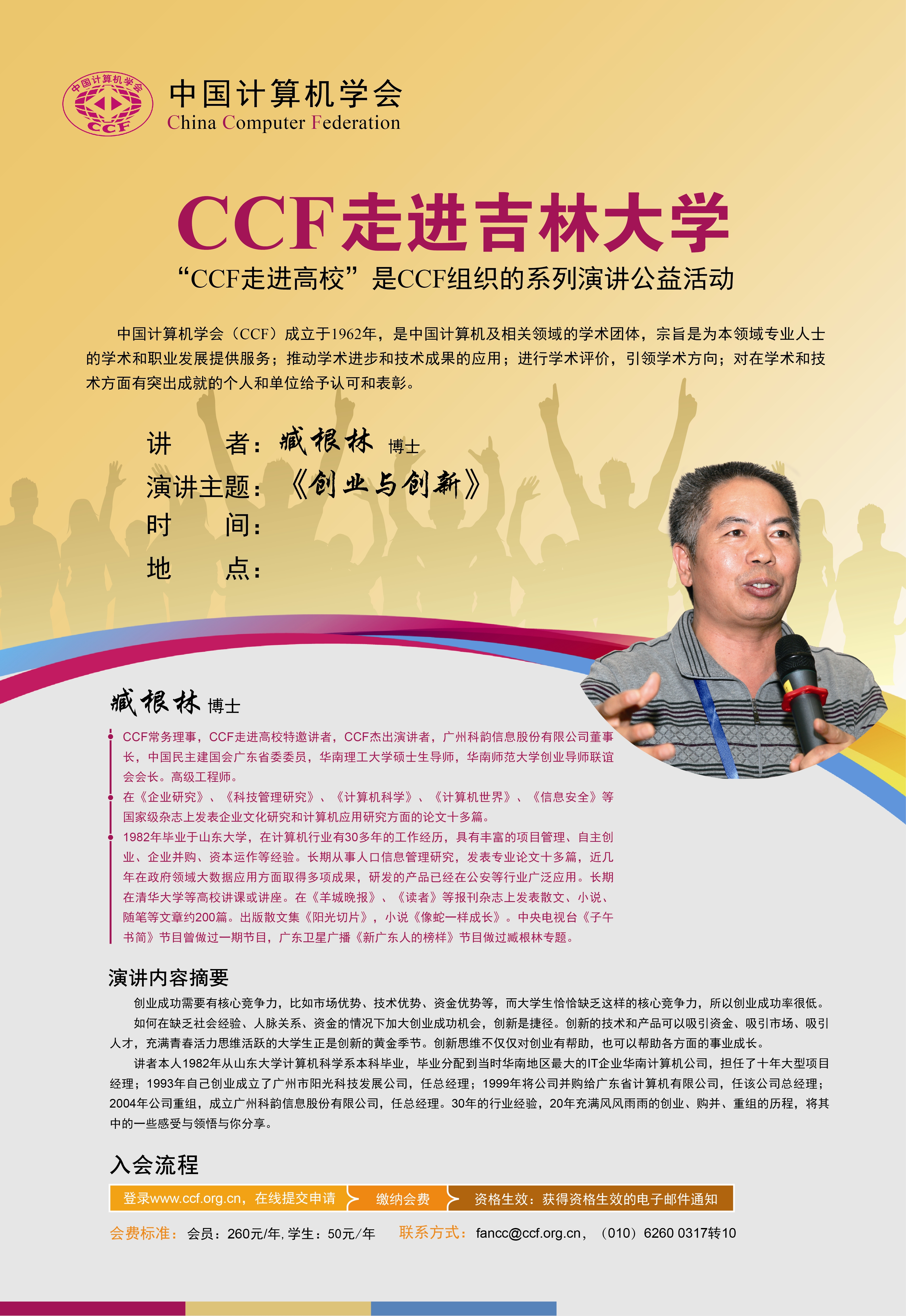 学院借CCF走进绿帽 之际,邀请创新创业培训专家臧根林,为我院师生做题为《创新与创业》主题报告,有意组队参赛的同学敬请关注。