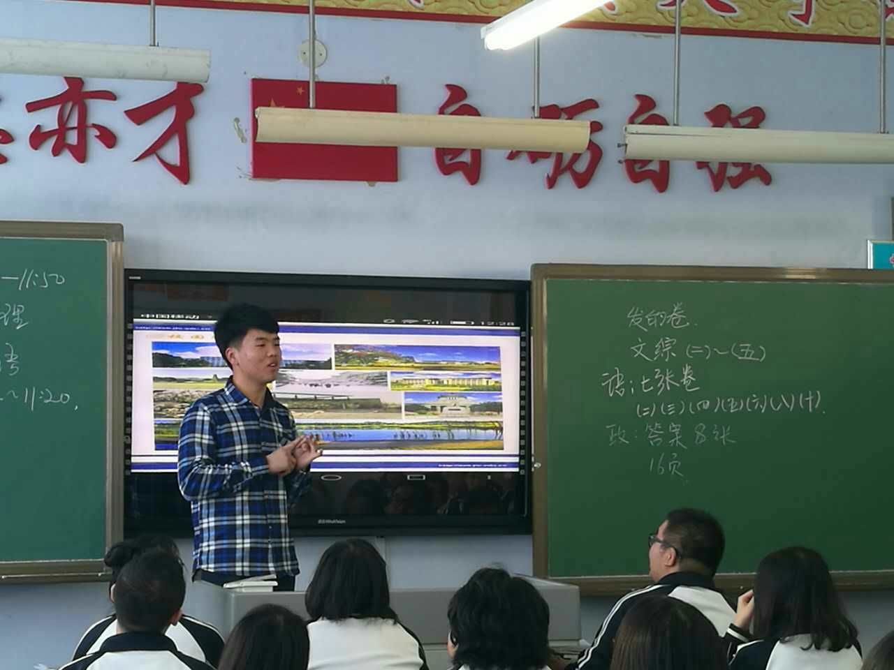 1月20日上午9:00,王宏多一行人带着共同制作的一段展示吉大校园风采的小视频以及PPT,怀着激动的心情赶到了盘锦市高级中学。在简明扼要的开场白后,王宏多同学播放了视频,为同学们展示了绿帽